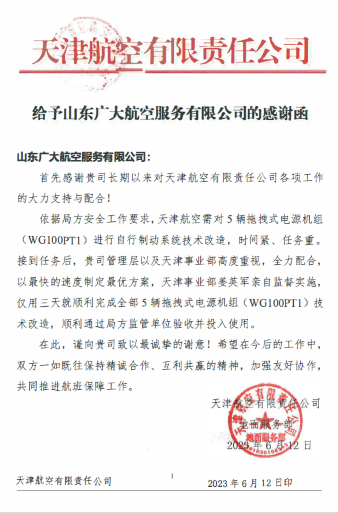 6月初,天津航空公司根據(jù)局方安全管理要求對五臺電源機(jī)組進(jìn)行自行制動系統(tǒng)技術(shù)改造,改造時需對五臺電源機(jī)組停用。客戶表示這五臺機(jī)組是主力車型,全部停用會影響正常工作,希望以最快的速度,最短的時間完成改造。時間緊任務(wù)重,山東廣大航空服務(wù)有限公司(以下簡稱“廣大航服”)…